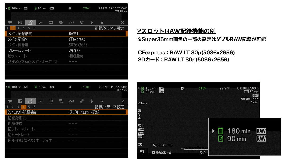 同様にSuper 35mm記録の場合は下表となる。XF-AVC/XF-AVC S/XF-HEVC S記録の部分に違いはないが、RAW記録の場合RAW ST/RAW LTでは一部の記録方式ではSDカードへの記録が可能となる。