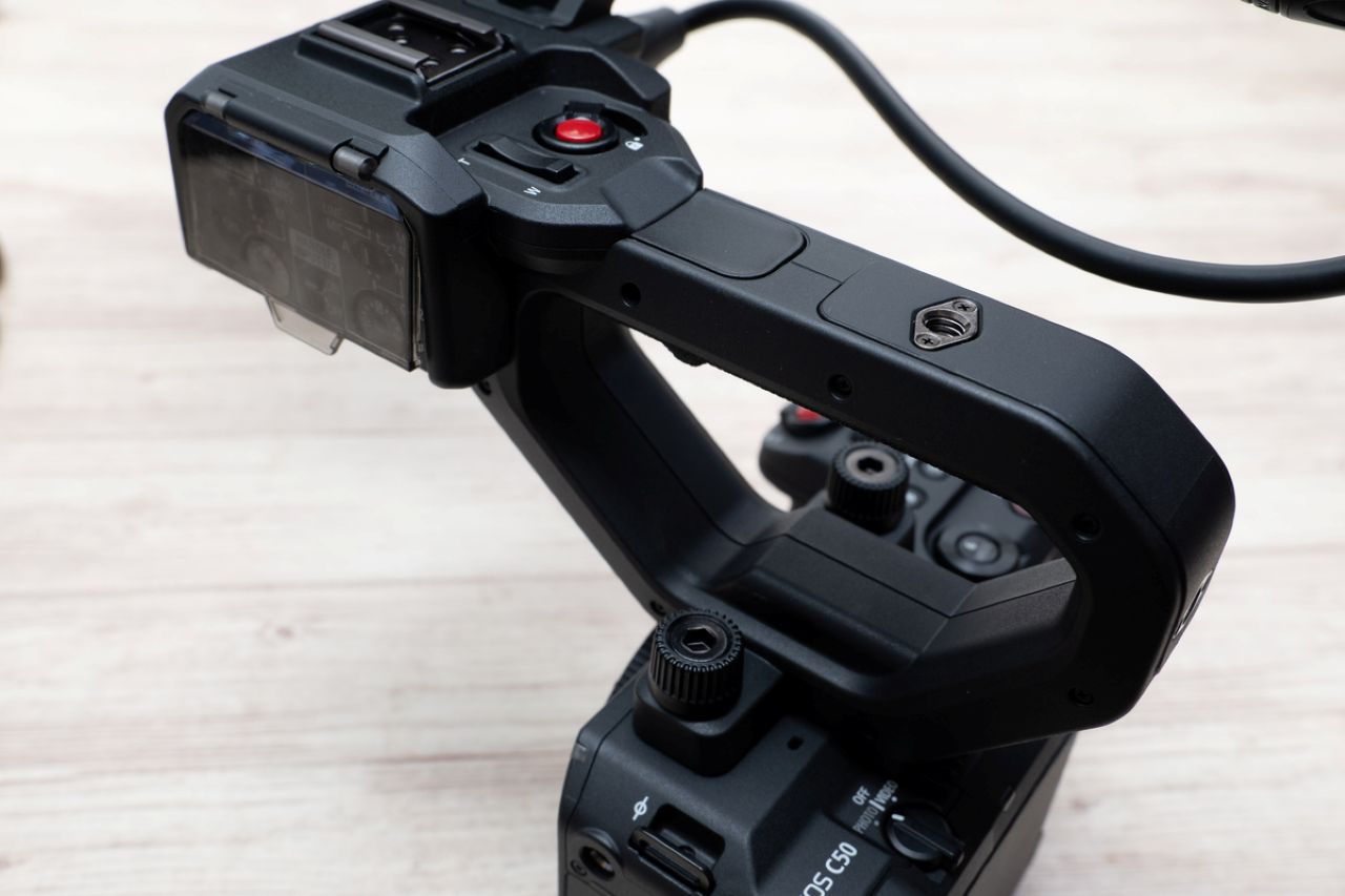 EOS C50にはXLRユニット一体型のハンドルが付属している。カメラ本体とハンドルユニットそれぞれにRECボタン・ズームレバーが備わる構成となるためハンドヘルド撮影時に非常に有効で、カメラをしっかりホールドしたまま、迅速かつ正確なズーム操作が可能だ。