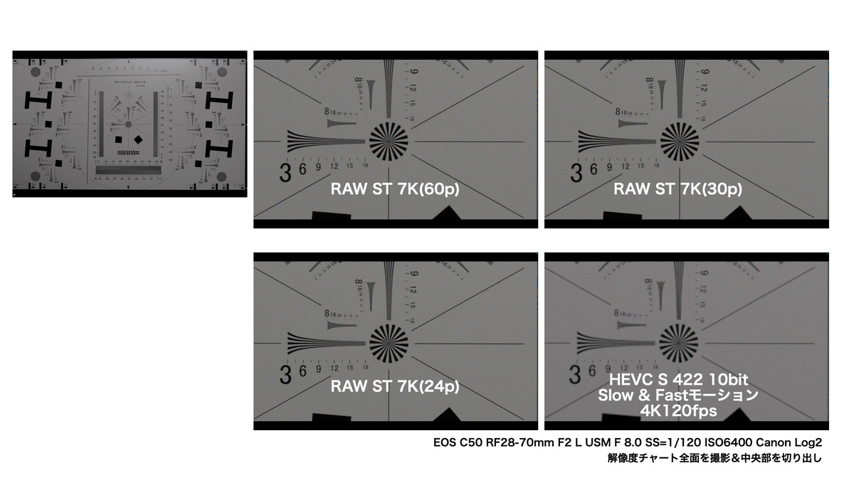 筆者的にはEOS C50発表当初より、この4K120pの画質に着目していた。そのため解像度チャートでの画質を評価した。60p〜24pまではRAW撮影の結果、非常に高い解像度で撮影できている。一方で4K120pはその解像度は落ちる結果となった。
