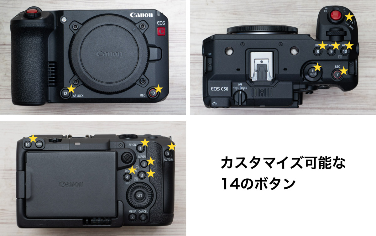 EOS C50のカスタム設定可能なボタンの多さも特徴のひとつである。