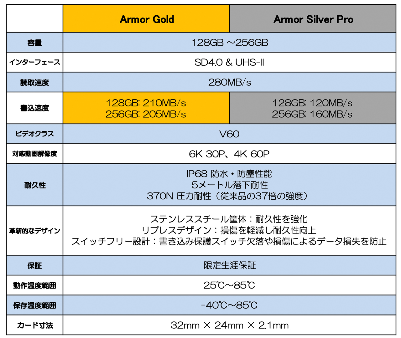 同社の「Lexar Professional 1800x SDXC UHS-II(GOLDシリーズ)」が速度的にほぼ同格であることから、ARMORシリーズは"頑丈になった1800x"と考えると分かりやすいだろう。