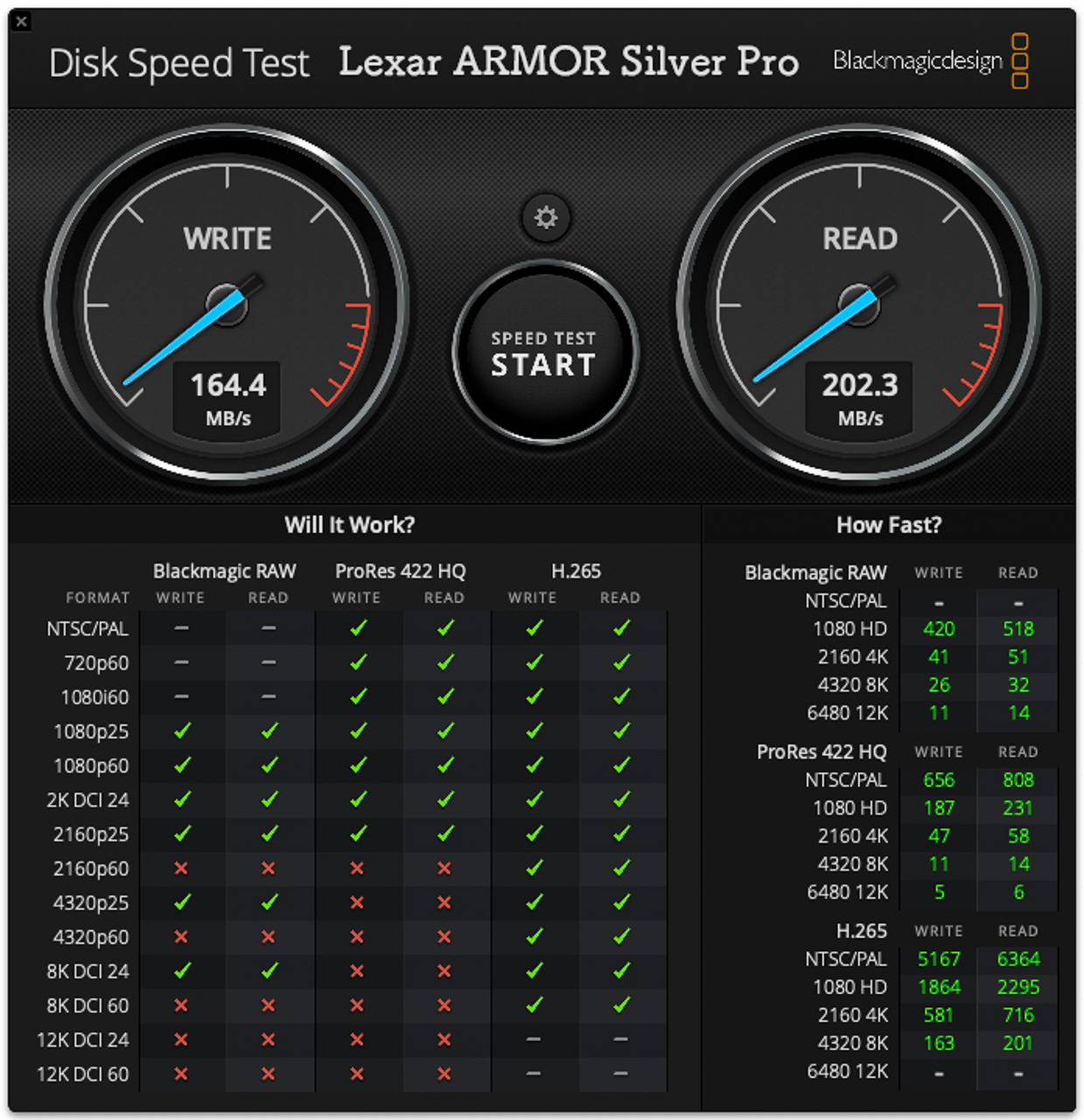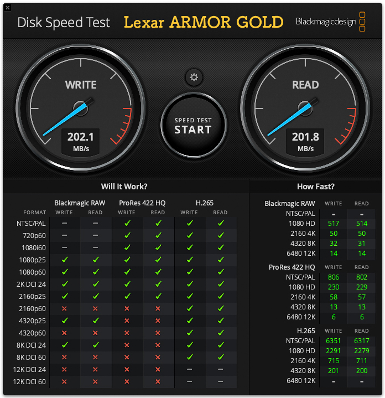 Blackmagic Disk Speed Testアプリを使用し、読み書きスピードを測定した(負荷は最大の5GB設定)。メディアリーダーはLexar推奨の「Lexar Professional CFexpress Type A/SD USB 3.2Gen 2リーダー(LRW530U-RNBNG)」を使用した。