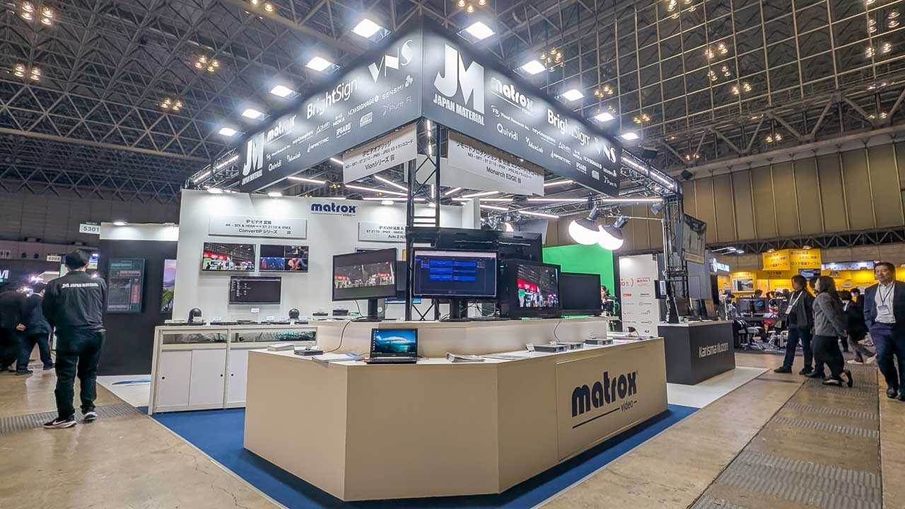 ジャパンマテリアルブースでは、同社取り扱いブランドであるMatroxの高品質・低遅延・安定性を兼ね備えたIP映像ソリューションが中心に展示された。