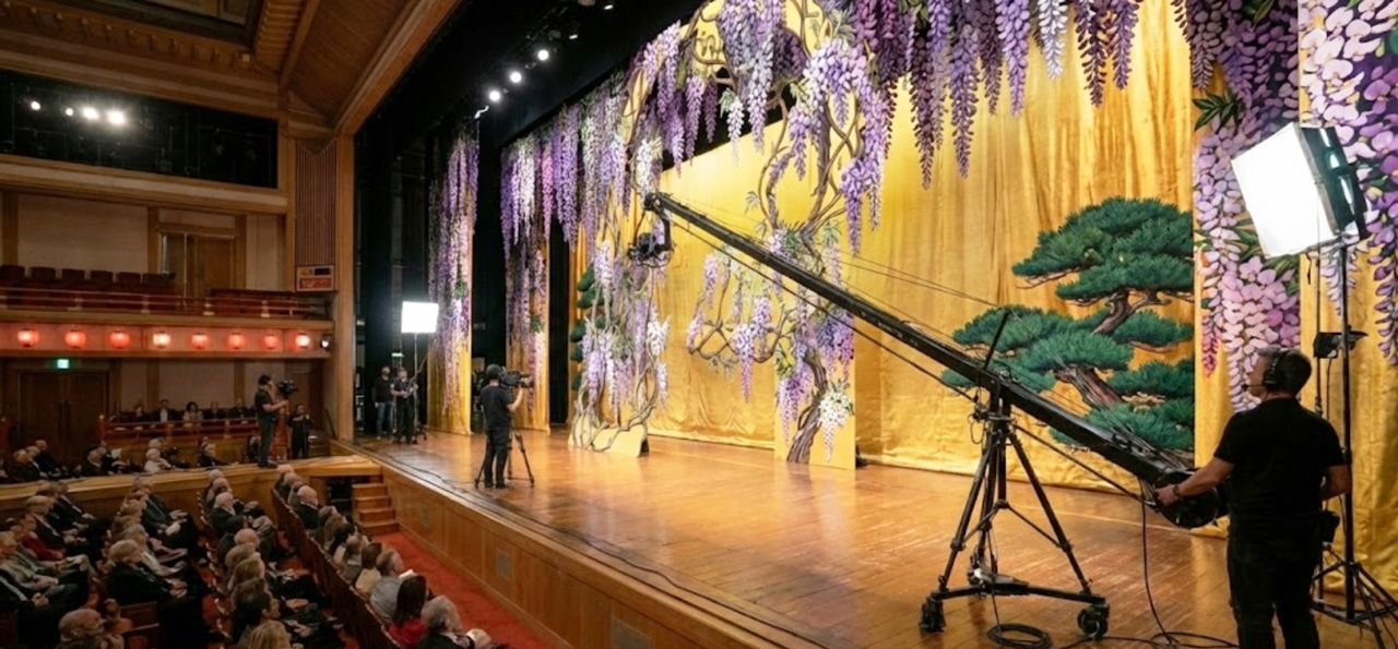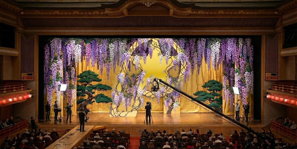 そして、ここだけの制作秘話を明かそう。 実はこの絢爛な歌舞伎舞台のビジュアル、一見すると最新のレンダリングエンジンによる3DCGに見えるかもしれない。しかし実は、「実写」の書き割り(背景画)と、最新のライティング機材を組み合わせて撮影されている——という設定で語らせてほしい。