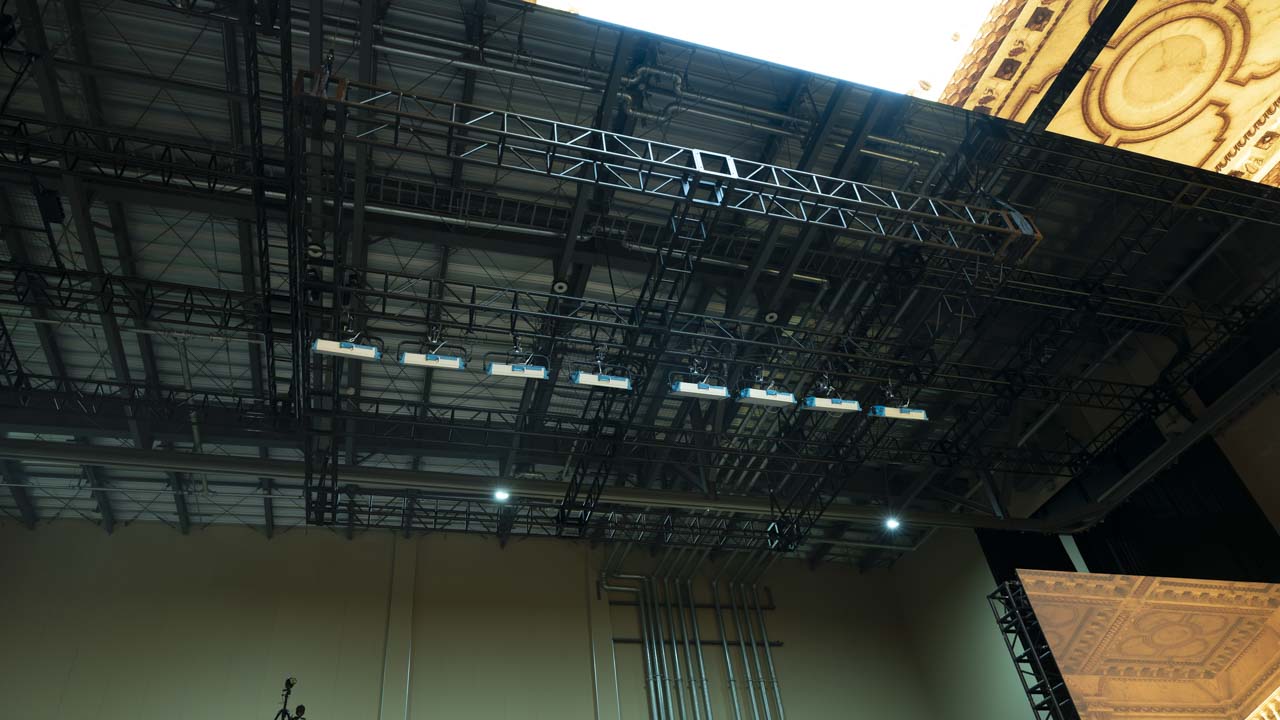 このスタジオの真価は、天井と壁に配置されたLEDの運用思想にある。天井面には明るさ4500nits、ピクセルピッチ5.2mmの高輝度パネルが組み込まれ、背景ではなく「環境光源」として機能する。さらに9面に分かれた天井パネルは、チルトやロールといった2軸での角度調整が可能だ。